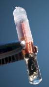 VeriChip. In particular, there is a thin, white rubber-like coating on one end that the tissue grows to so the chip